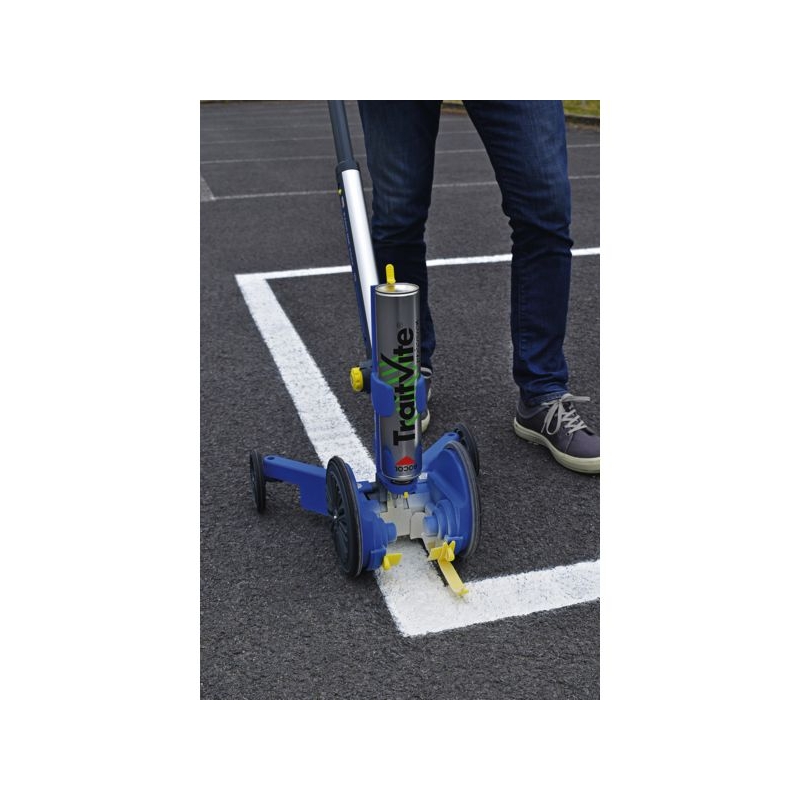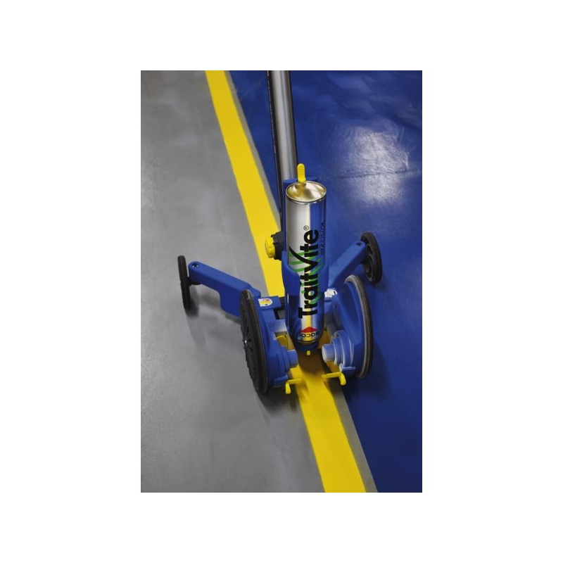 Système de marquage et traçage de lignes au sol, en intérieur ou extérieur. Trace des lignes droites ou courbes. Toutes largeurs entre 50 et 100 mm. Doté du système de ventilation Air Flow. Roues arrières réglables pour le traçage près des murs et racks. Mallette de rangement et de transport avec pile et flasques de protection antiadhérentes inclus. S’utilise avec les aérosols de peinture TraitVite précision.