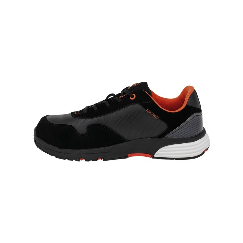 Tige en microfibre et croute de cuir, hydrofuge. Doublure en textile. Première de propreté anatomique et amovible en maille sur mousse PU. Semelle d'usure en caoutchouc / EVA. Semelle antiperforation textile. Embout de sécurité en composite. Poids : 558 g Coloris : noir/orange Pointures : 35 au 48 Norme : CE Cat II - EN ISO 20345 - S3 HRO SRC