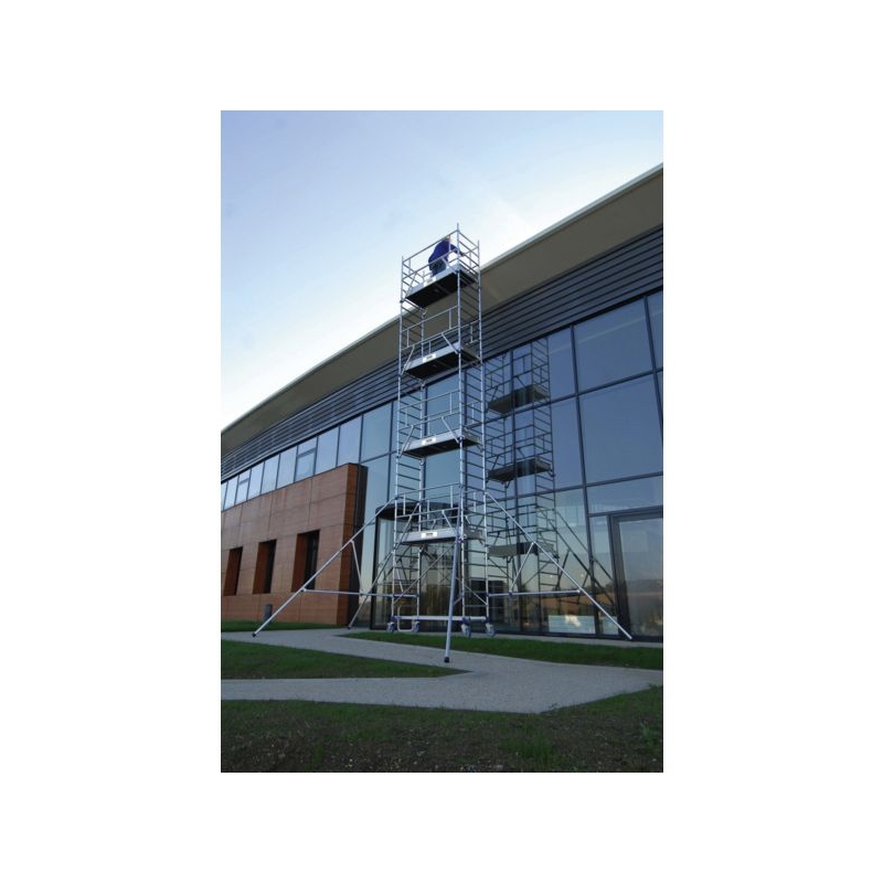 Utilisation sur sol plat et dénivelé (avec kit escalier en option), usage intensif. En acier galvanisé. Base monobloc. Plancher bac avec plinthes intégrées. Garde-corps monoblocs. Montage des planchers et des garde-corps en sécurité par une seule personne. Roues réglables Ø 250 mm. Charge maxi : 200kg/m² Normes : NF 096 - NF EN 1004-1 - décret 2004-924 et circulaire DRT 2005/08