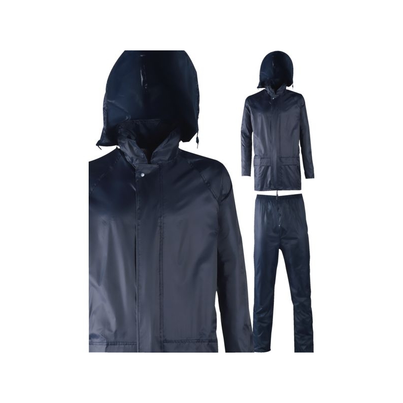 Polyester/PVC souple. Veste : capuche fixe et cordon de serrage, fermeture à glissière. Pantalon : serrage élastique à la taille. Coloris : bleu marine, jaune, vert Taille : M à 3XL