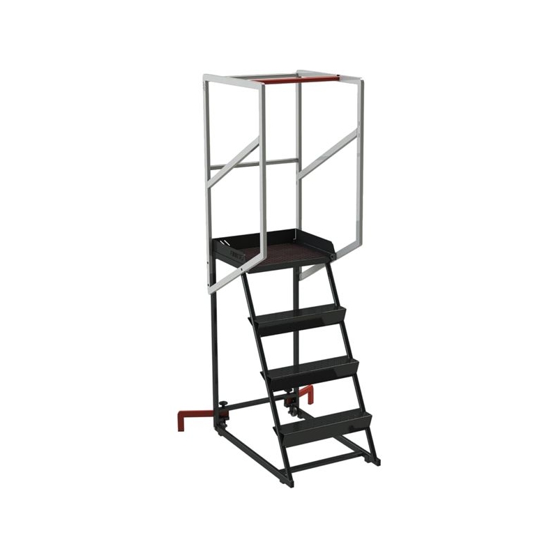 En acier mécano soudé, spécialement conçu pour les espaces restreints et passages étroits. Marches autoporteuses antidérapantes, garde-corps de sécurité et plateforme en tôle alu larmée antidérapante. Équipé de lisses et sous-lisses pour une plus grande sécurité. Réf. 22550-4 et 22550-5 équipées de stabilisateurs orientables et d'une barre anti-chute. Dimensions plateforme : 408 x 480 mm Conforme à la norme EN 131. 85% recyclé, 95% recyclable