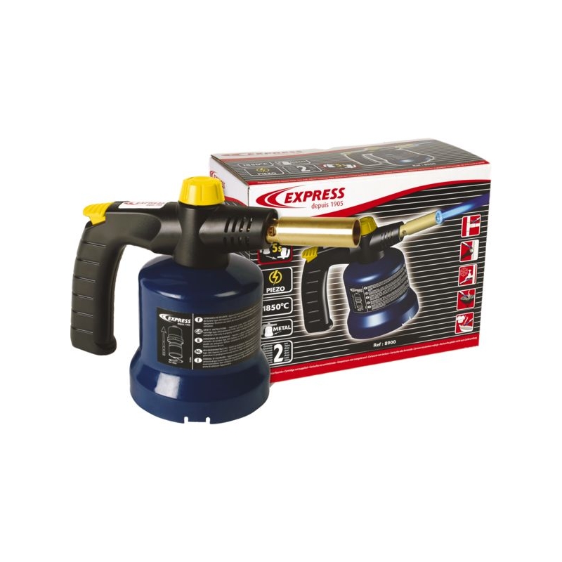 Allumage Piezo. Grande autonomie supérieure à 1h15. Cloche en métal. Flamme dard. Travail tête en bas pendant 15 sec. Température de chauffe : 1850°C Longueur fausse flamme : 170 mm Tuyère : 16 mm