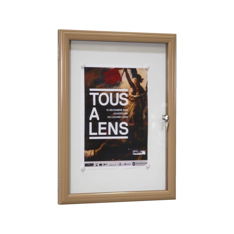Vitrine réversible avec fond tôle laquée électrozinguée (affichage magnétique). Porte battante démontable avec charnière inox. Encadrement aluminium anodisé, façade verre Sécurit 4 mm. Fermeture par serrure dans le vitrage. Fixation murale 4 points. Épaisseur hors-tout : 35 mm Épaisseur utile : 21 mm Existe en noir, gris et rouge.